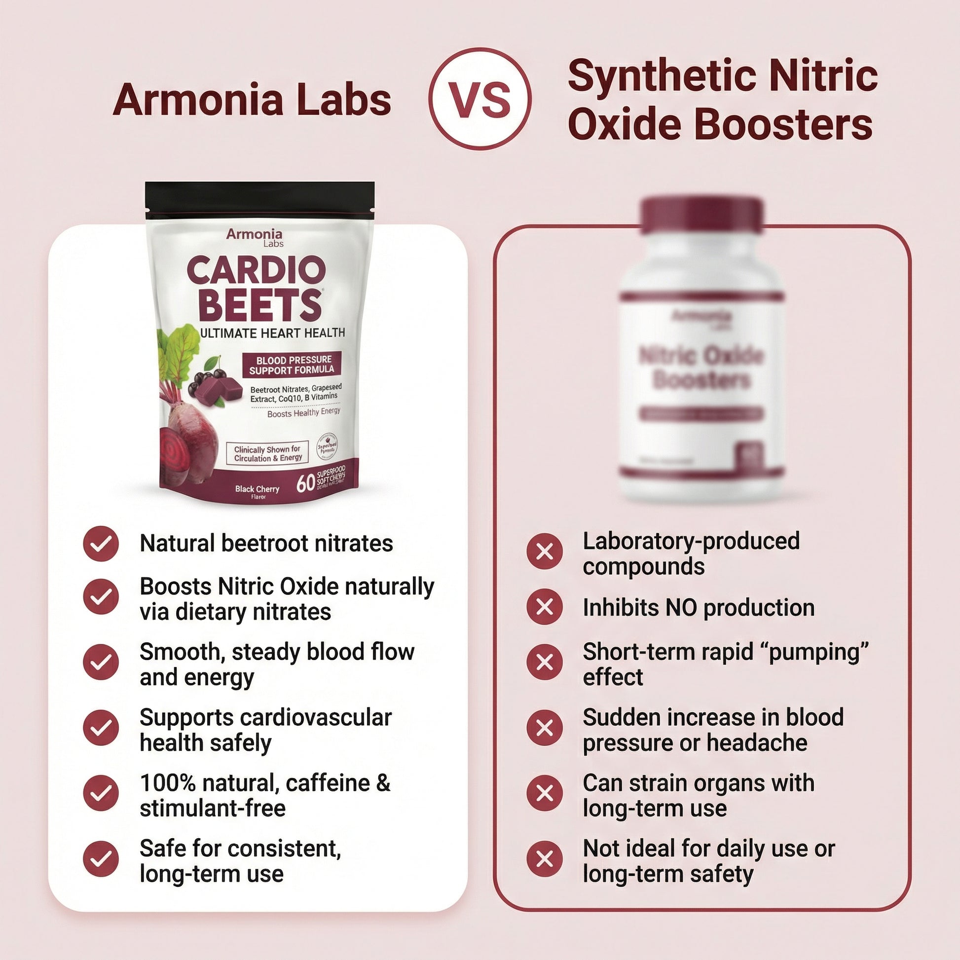 Most beetroot supplements contain only beetroot. ArmoniaLabs combines beetroot with grape seed extract, CoQ10, and B vitamins for more comprehensive cardiovascular support through multiple pathways. Plus, convenient chewable format with great taste.*